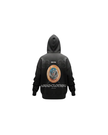 Hoodie negro en algodón de alto gramaje que destaca por su proceso de lavado artesanal que crea un acabado de iluminaciones sutiles. Complementan el diseño detalles metálicos y un banderín...