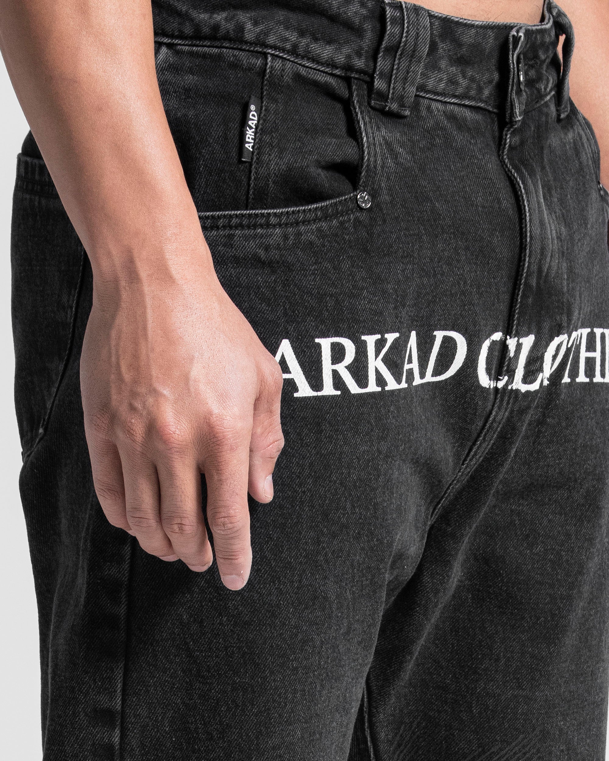 Pantalón de denim negro de corte recto. Destaca por sus diseños estampados estratégicamente distribuidos: blanco en la parte frontal y tono sobre tono de carácter discreto en las piernas, aportando un carácter visual distintivo de la colección.