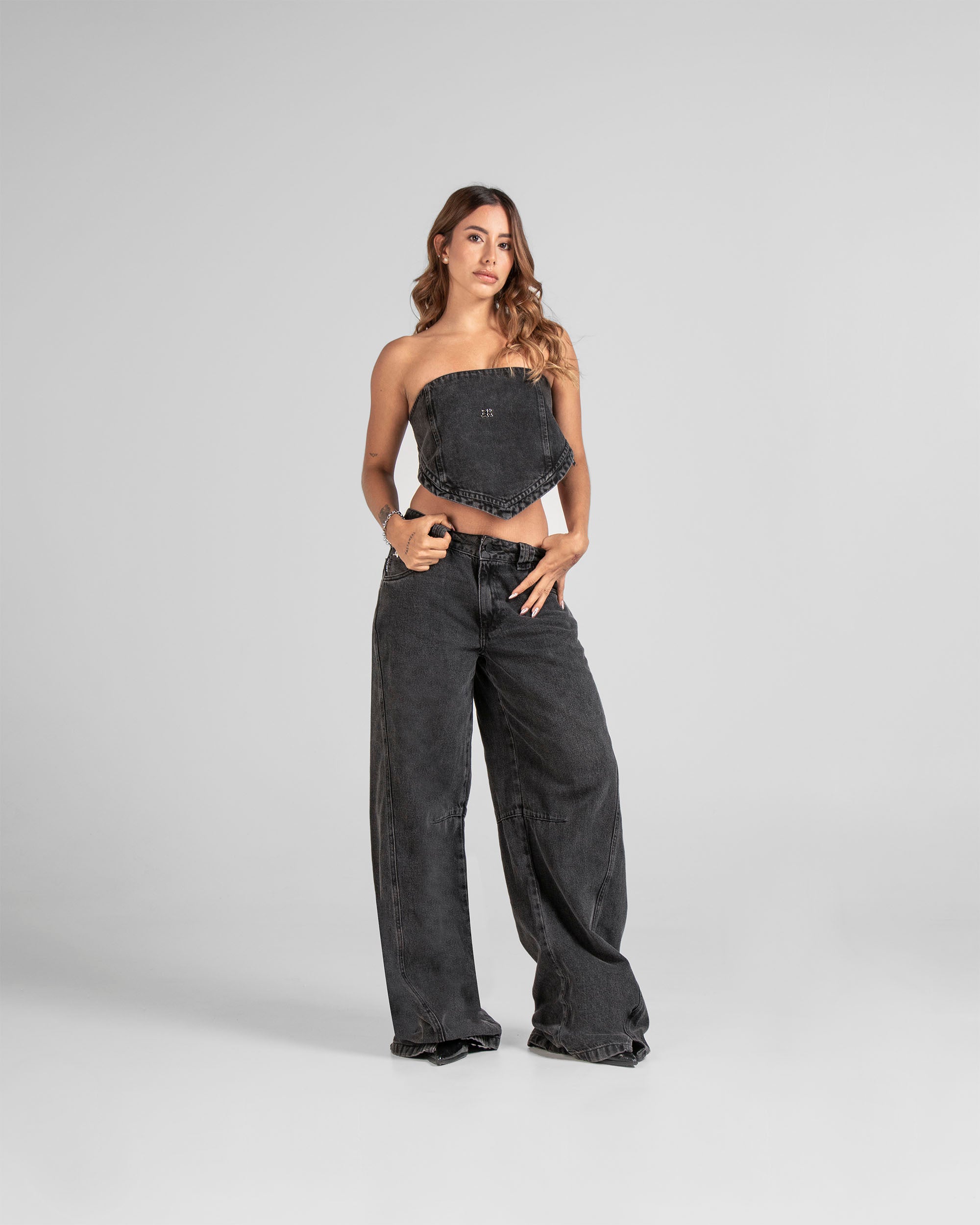Este top de jean negro destaca por su diseño moderno con cortes estratégicos y una hebilla ajustable en la parte posterior que garantiza un ajuste personalizado y cómodo.