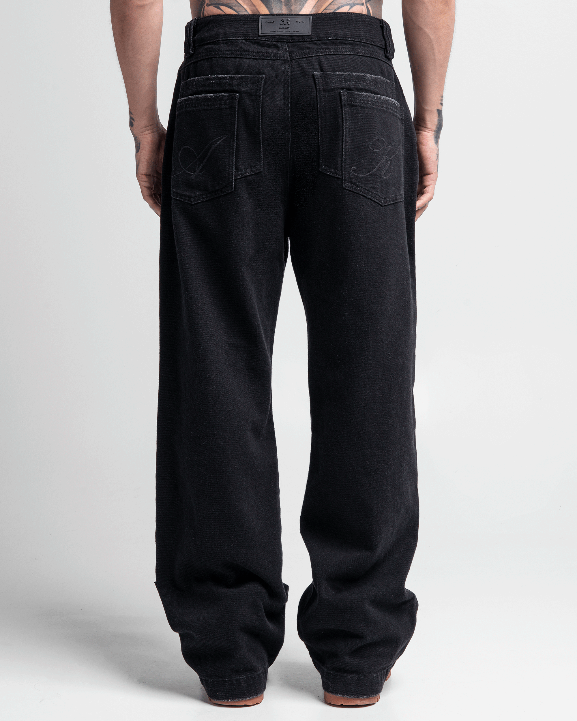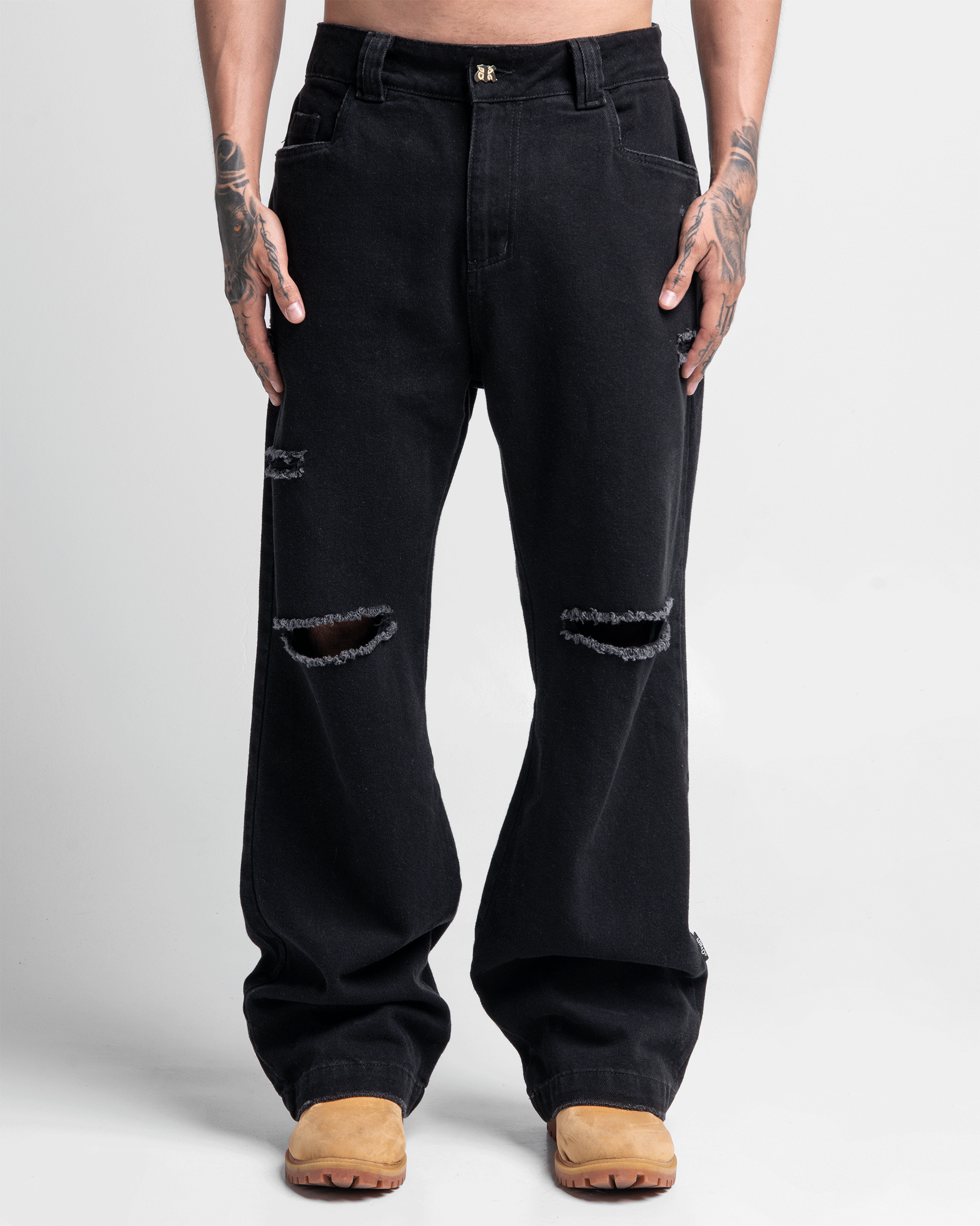 Pantalón de denim negro con diseño de destroyed. Bolsillos posteriores sobrepuestos, decorados con bordados. Detalles exclusivos como rubber, botón, banderín y remaches con la marca aseguran calidad y autenticidad.