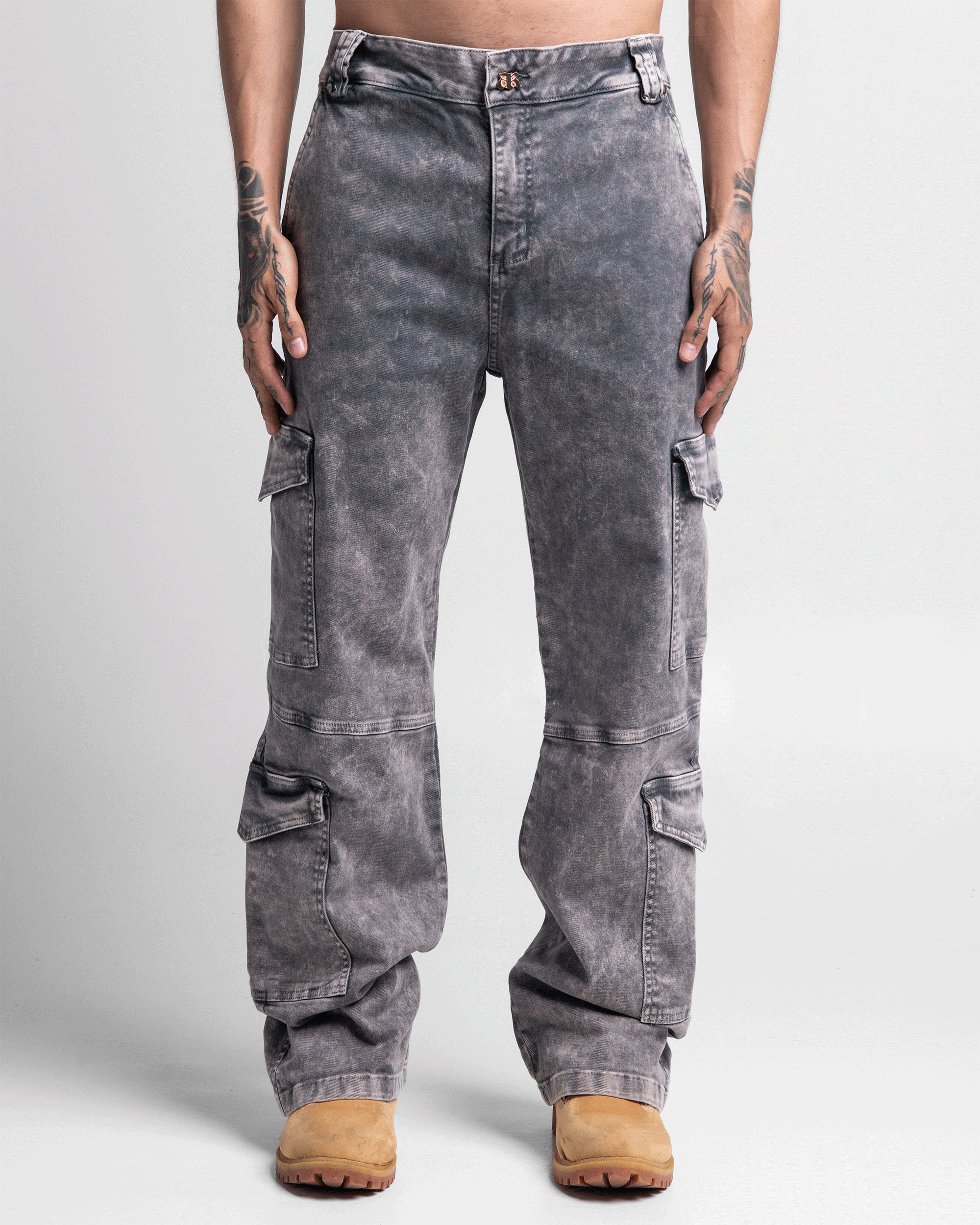Este pantalón cargo en tela denim presenta un acabado dirty de lavanderia que combina tonos grises y beige, aportando una tonalidad única.