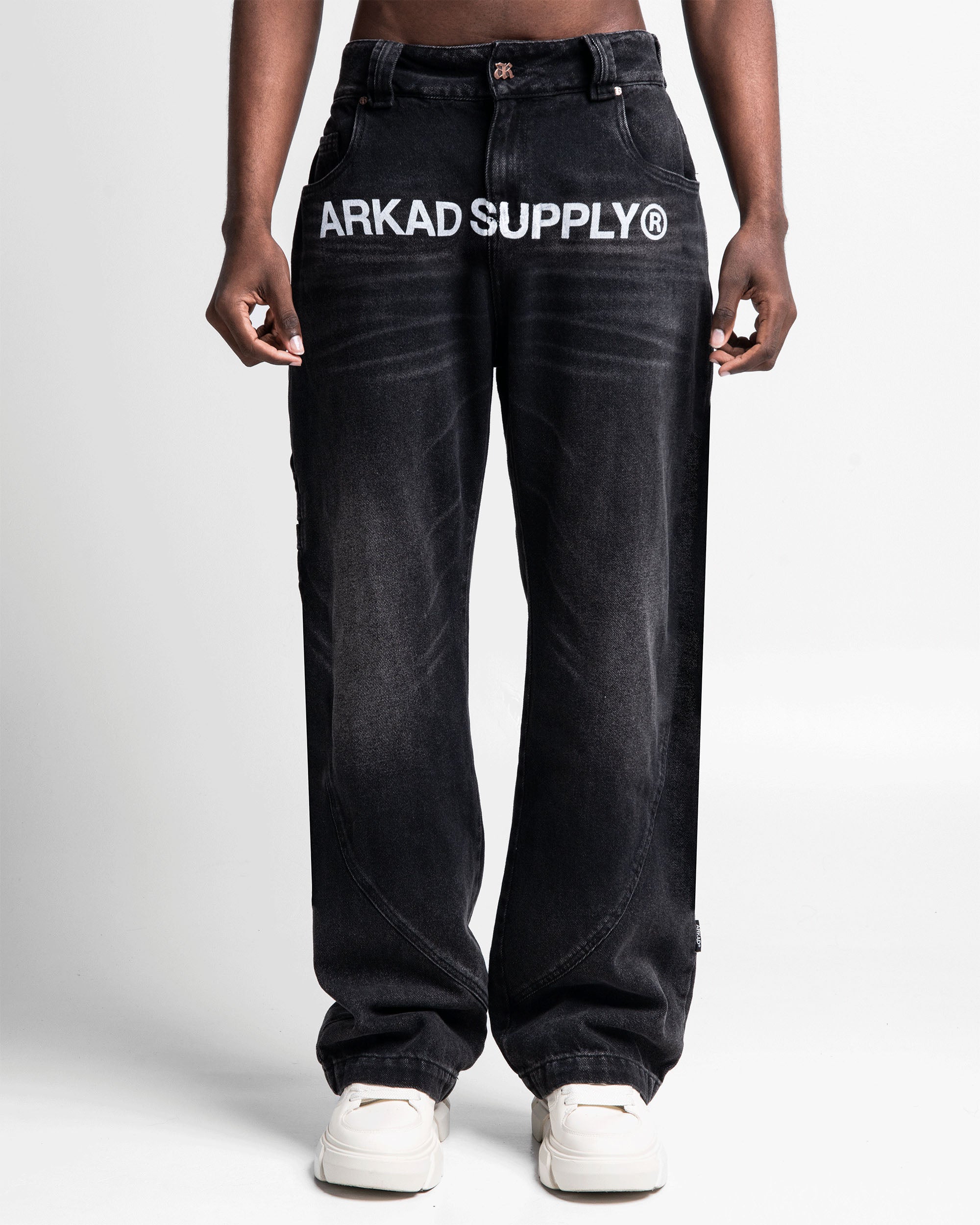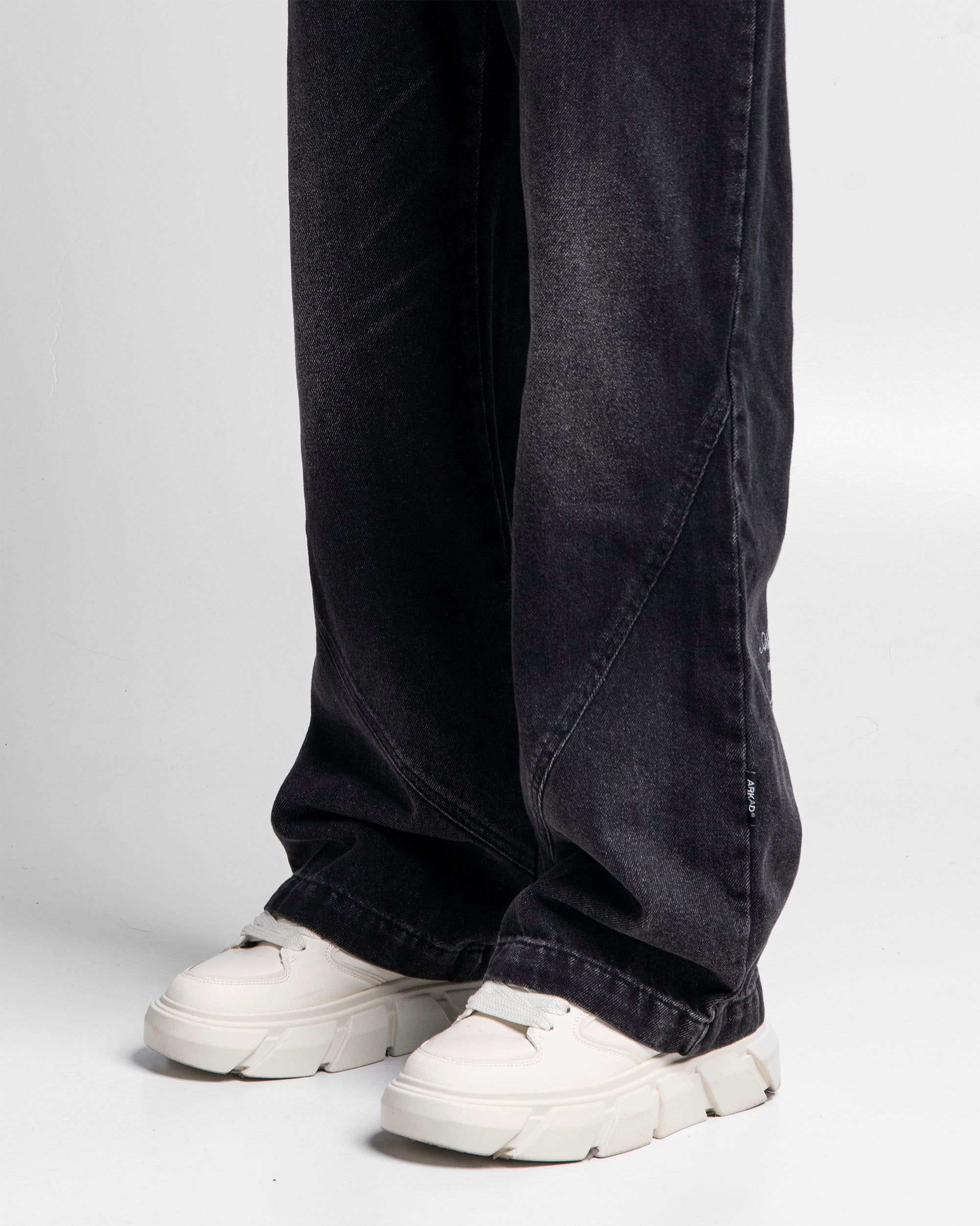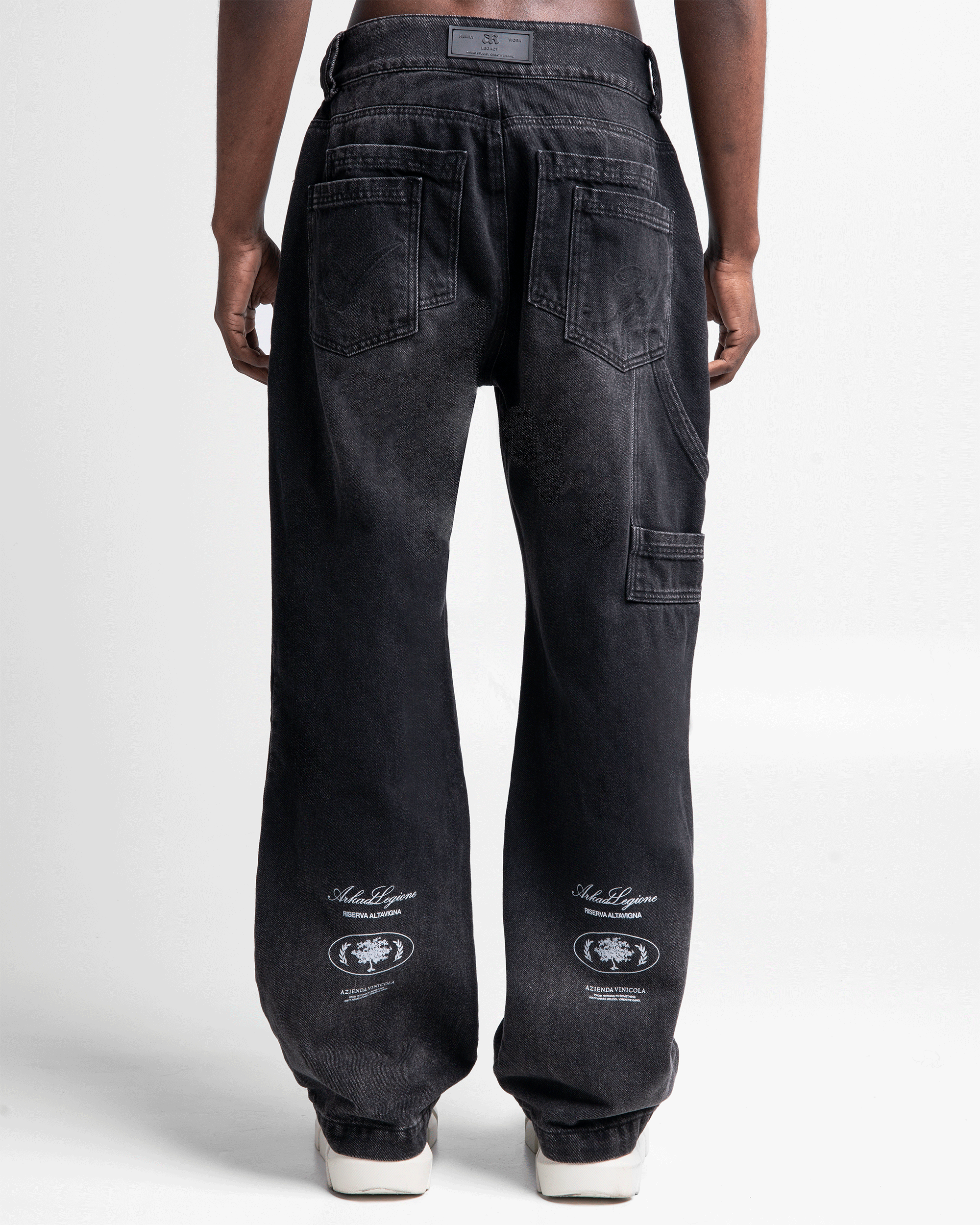 Este pantalón en denim negro presenta un delicado proceso de lavandería que genera sutiles iluminaciones grisáceas, resaltando su textura.