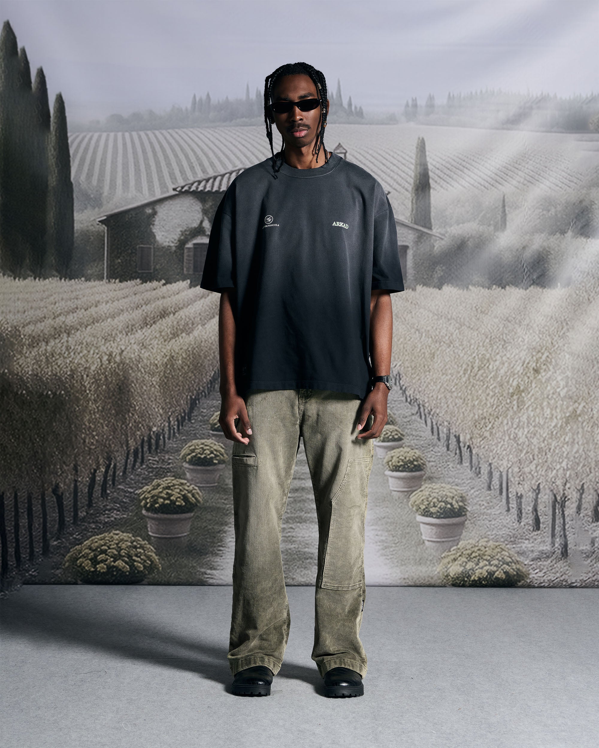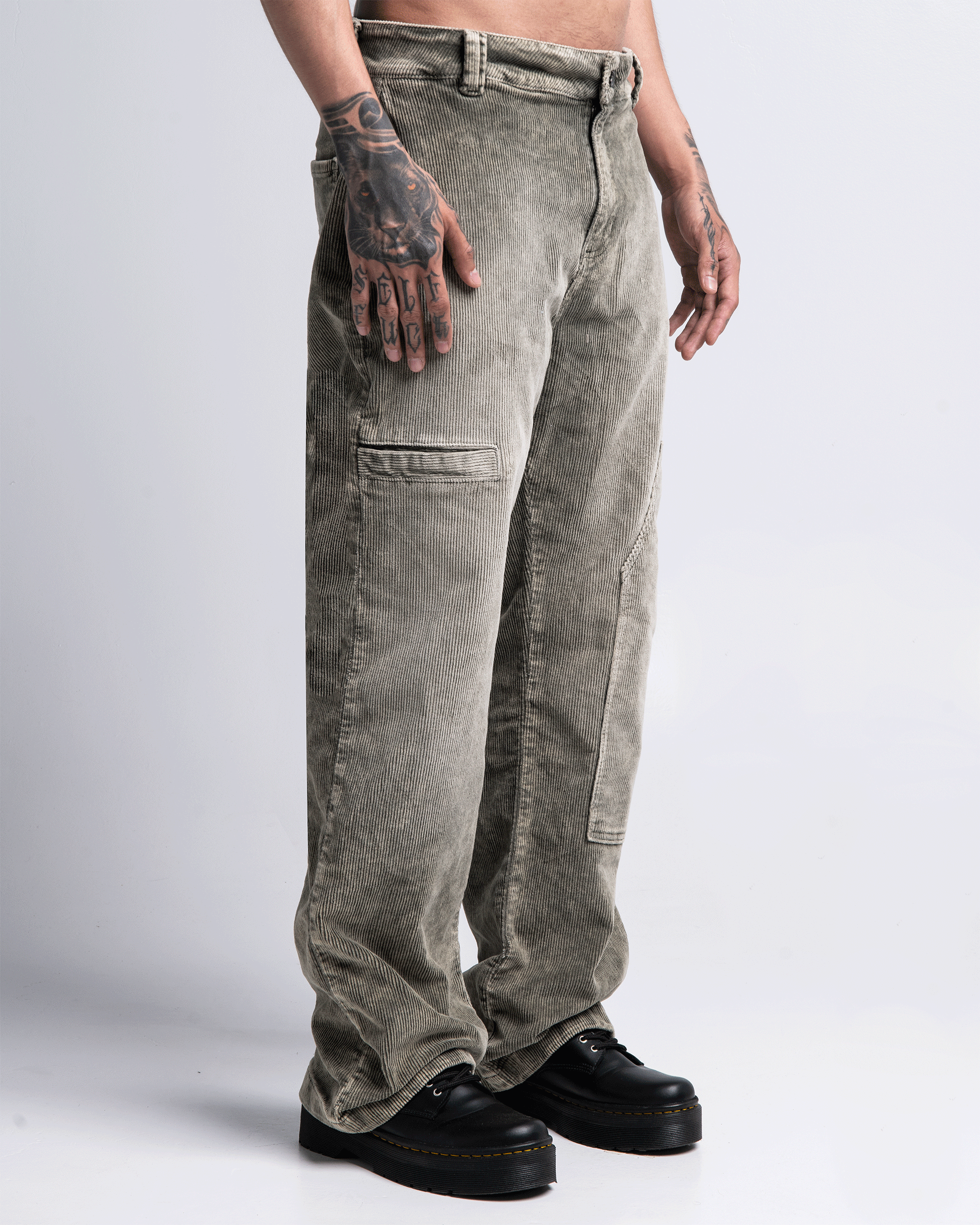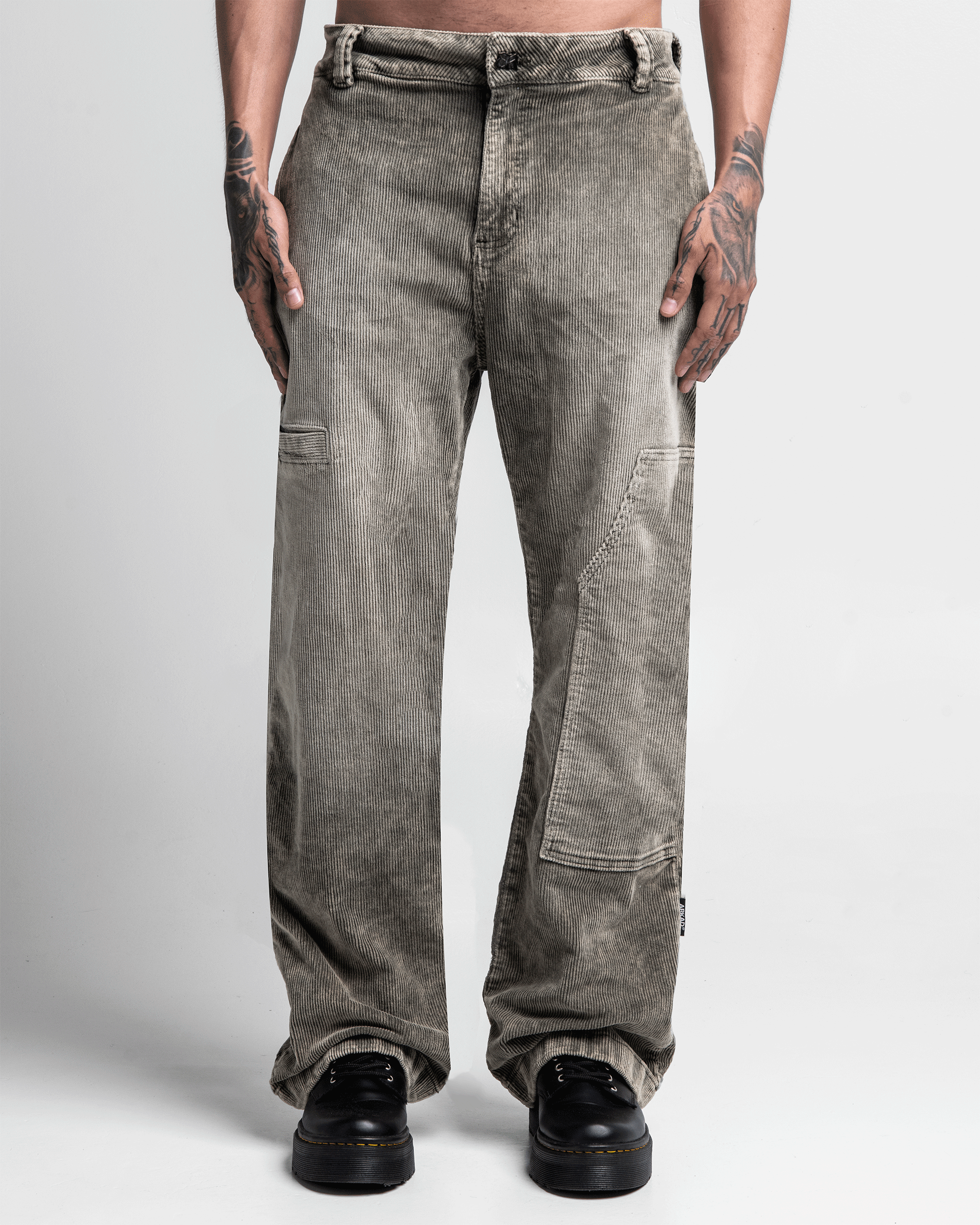 Este pantalón de tela corduroy presenta un acabado acid wash que le aporta un tono desgastado único.