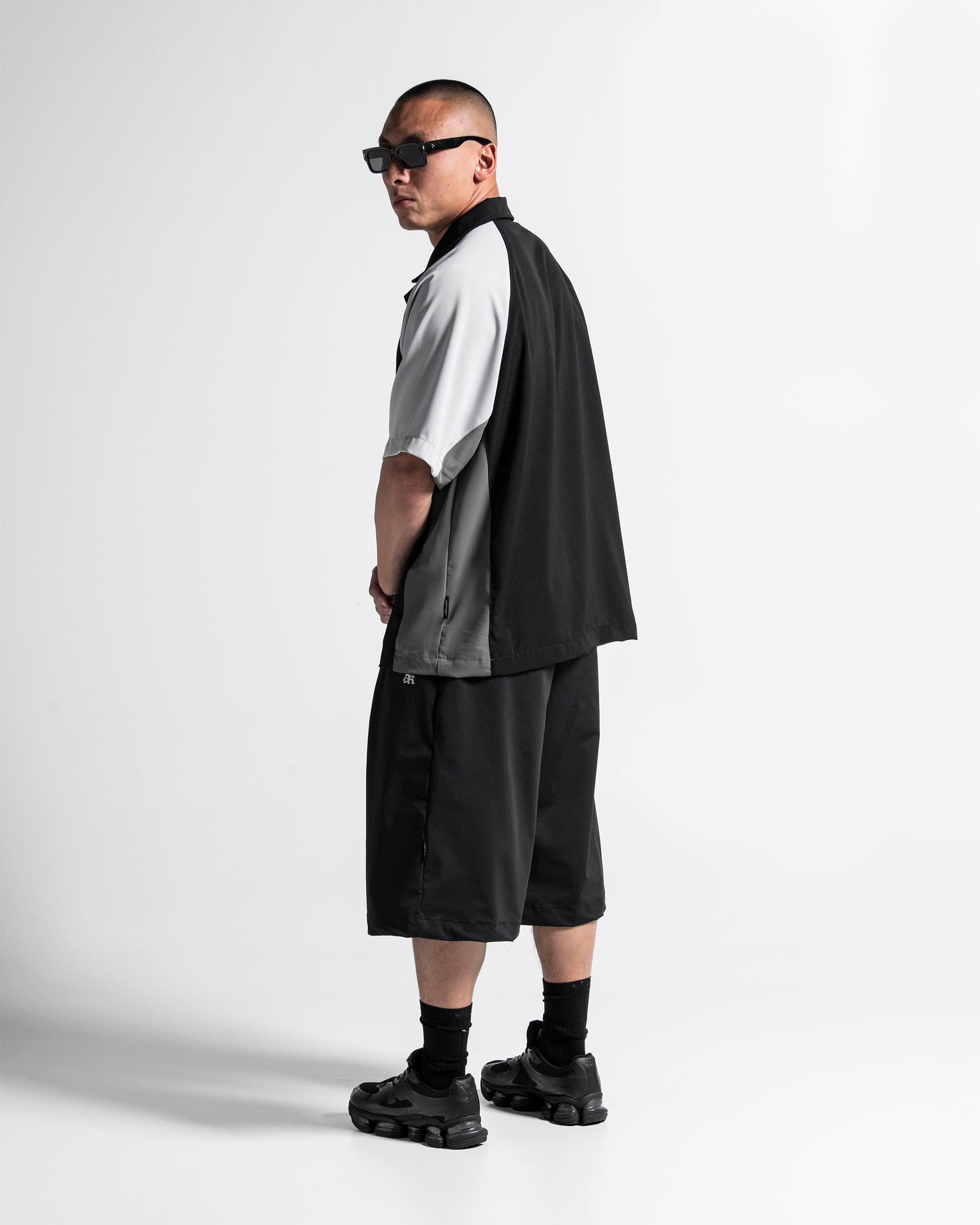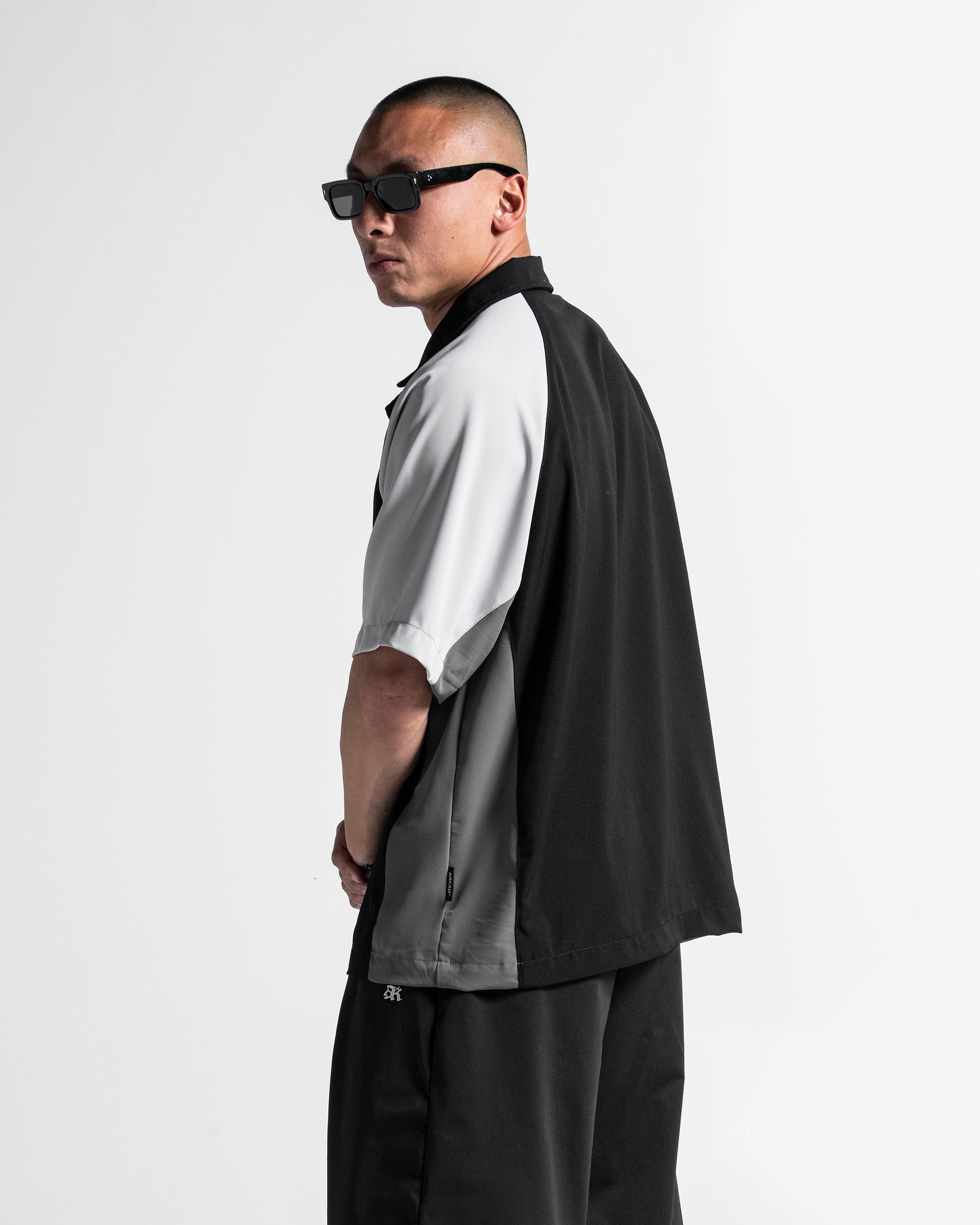 Camisa oversize de botones que combina un cuerpo clásico negro con mangas en tonos gris y blanco.