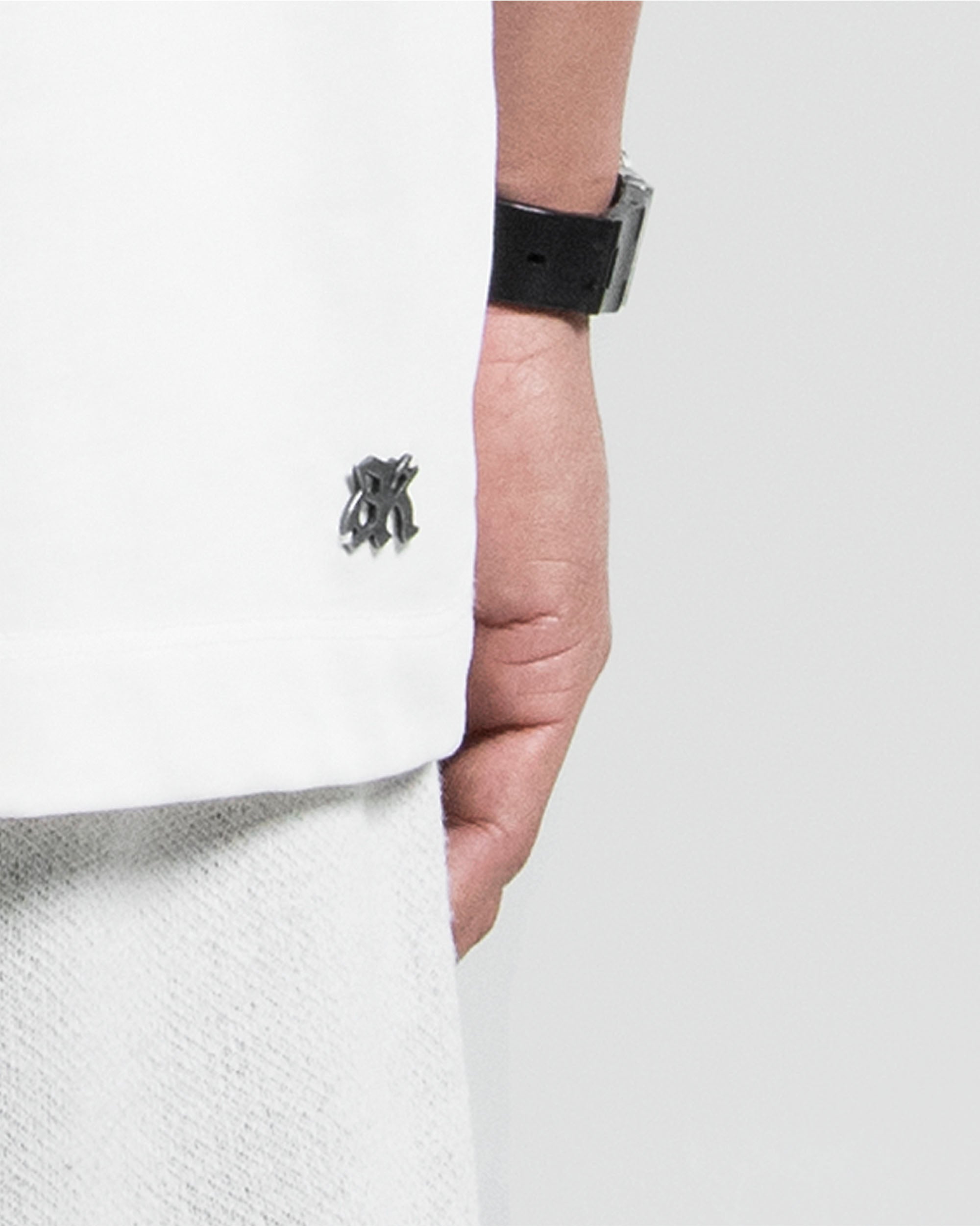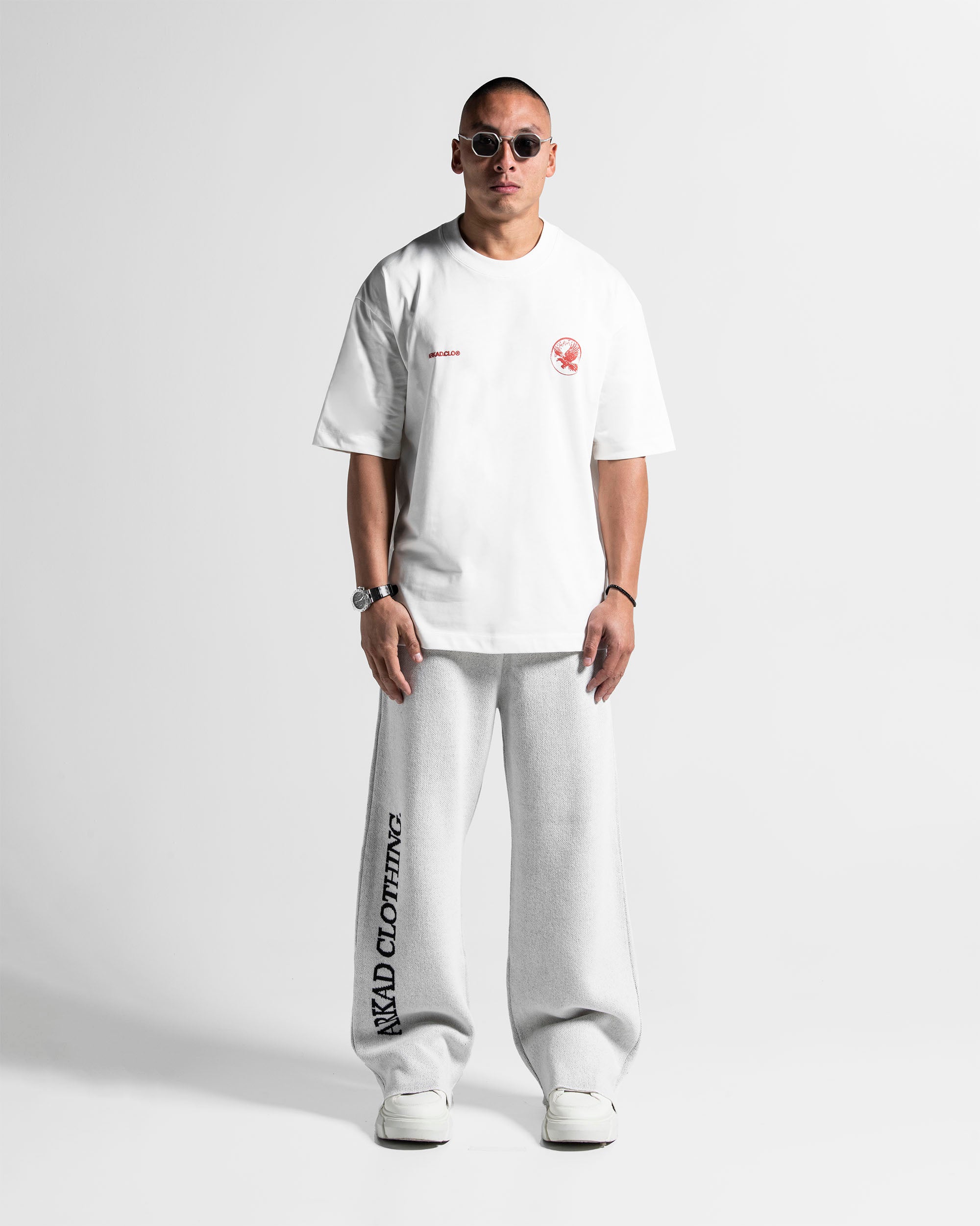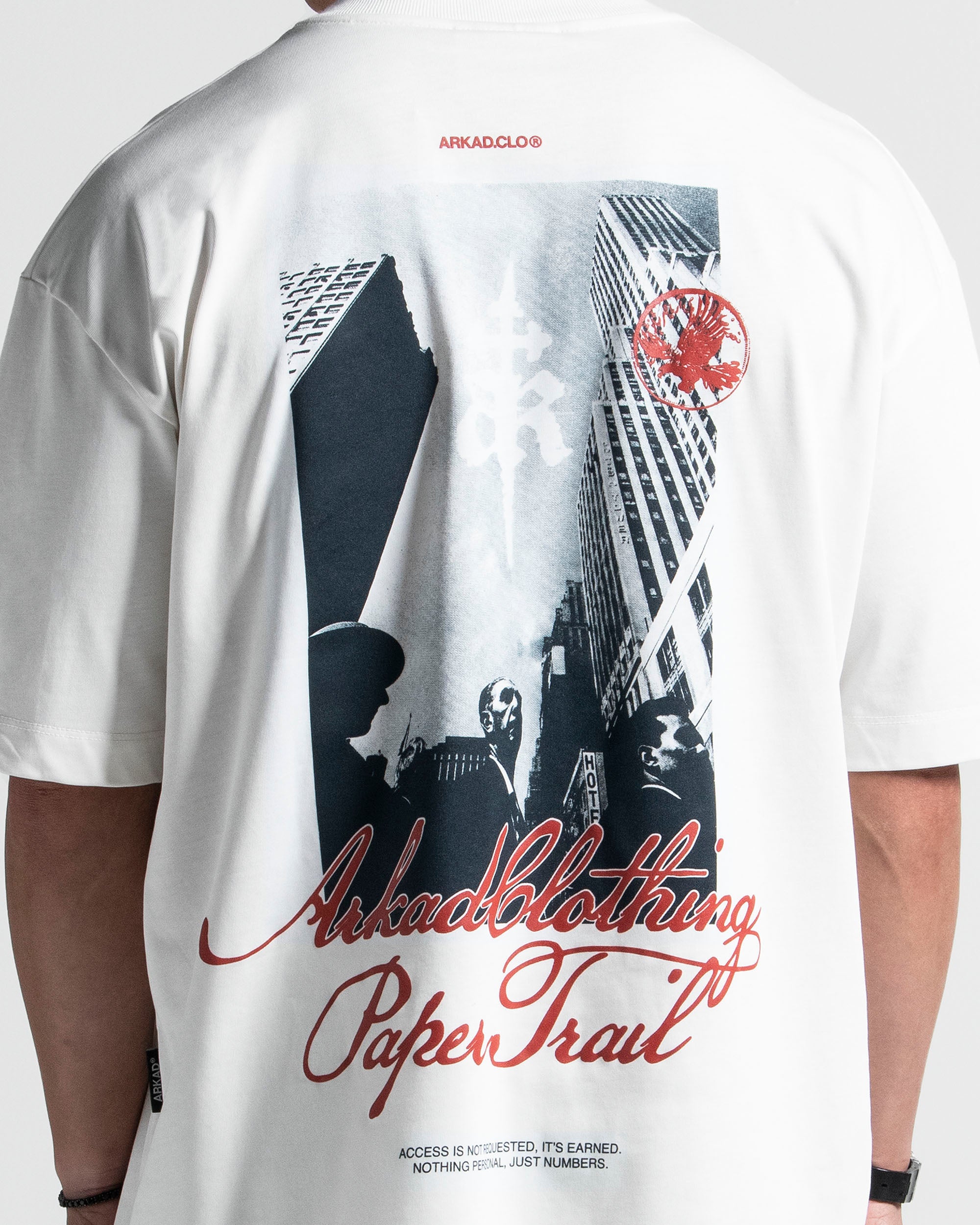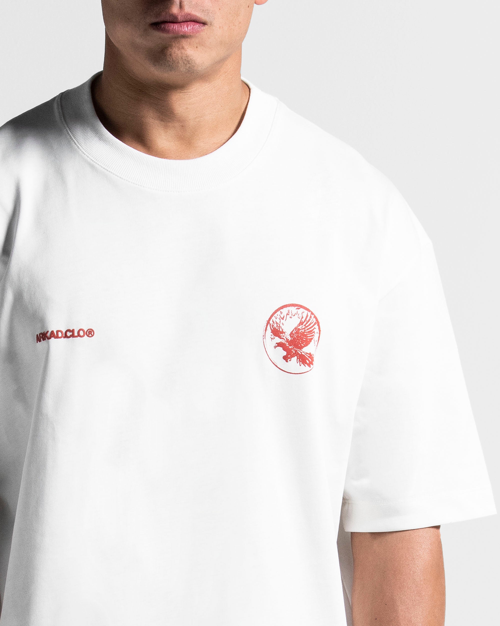 Camiseta oversize blanca en algodón de alto gramaje.Presenta gráficos estampados en frente y espalda, complementados con detalles de bandera y placa metalica bordada que reflejan la identidad auténtica de Arkad. El modelo mide 1.77 y usa talla M.