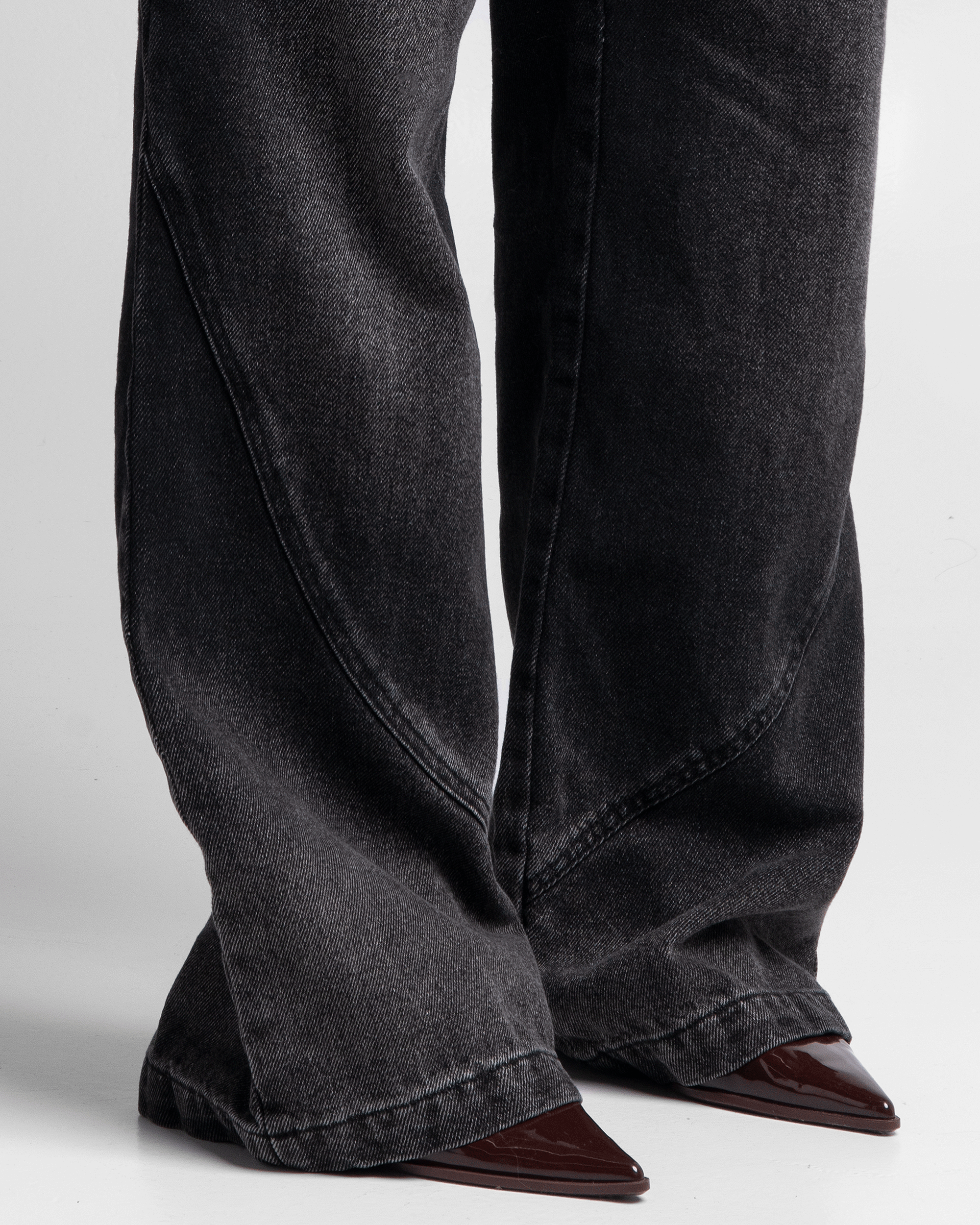 Este pantalón en denim negro -diseñado con un fit masculino pero apto para uso unisex- presenta un delicado proceso de lavandería que genera sutiles iluminaciones grisáceas, resaltando su textura.