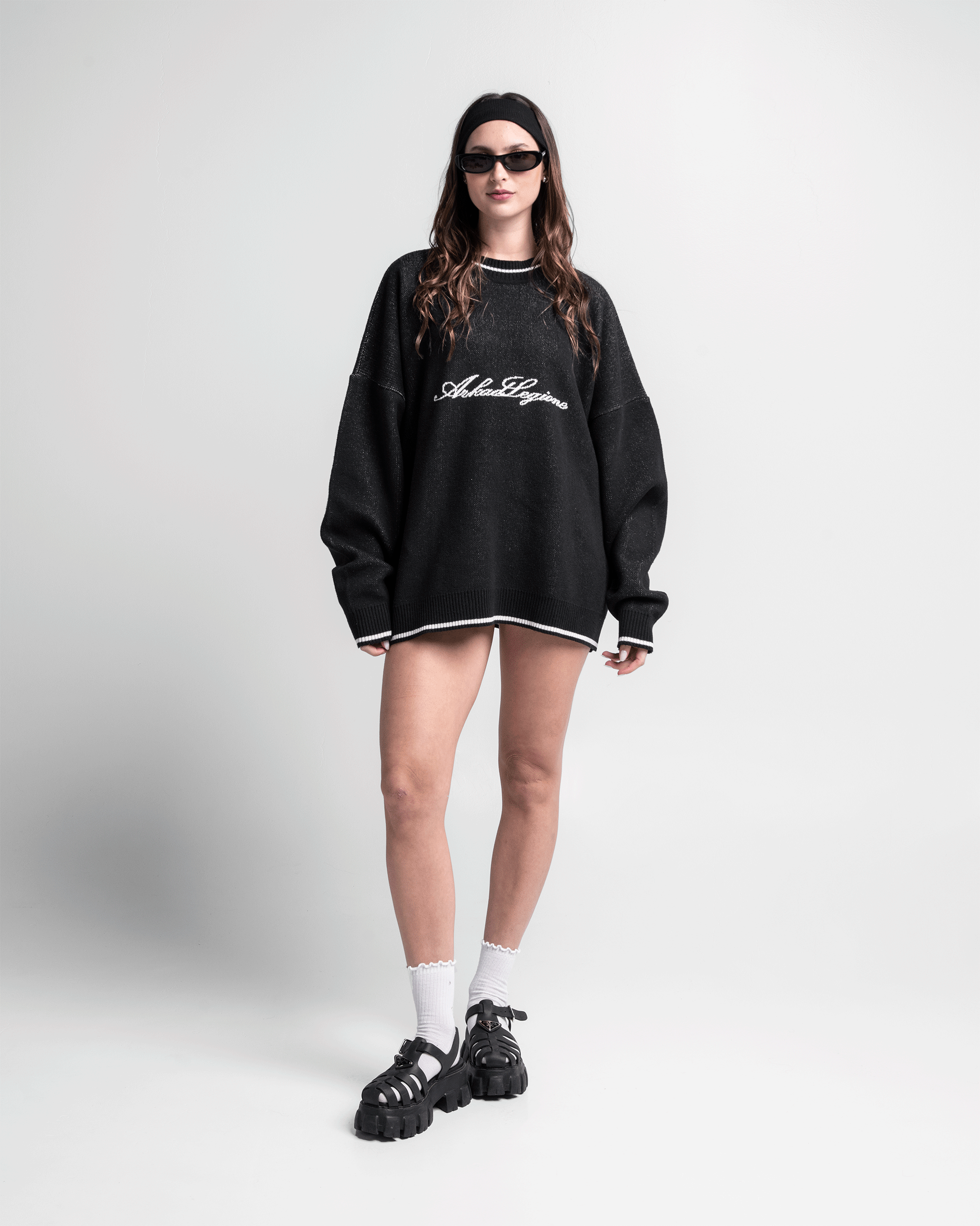 Este suéter tejido combina comodidad y estilo con un diseño único. Presenta gráficos exclusivos de la colección en la parte frontal y posterior. Además, incluye una placa metálica con la marca. Perfecto para quienes buscan una prenda con identidad y calidad.