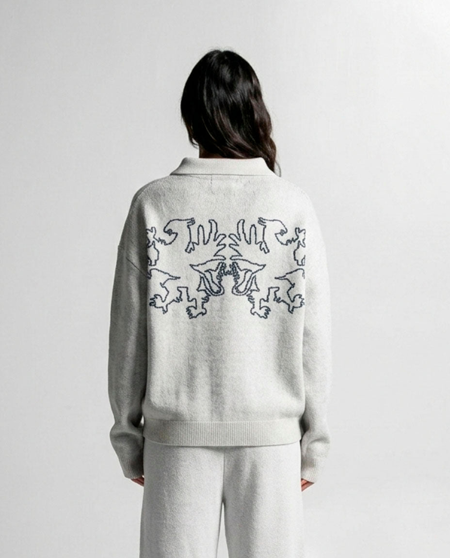 Knit Sweater oversize confeccionado en tela tejida gruesa y pesada con cuello polo y cierre frontal.