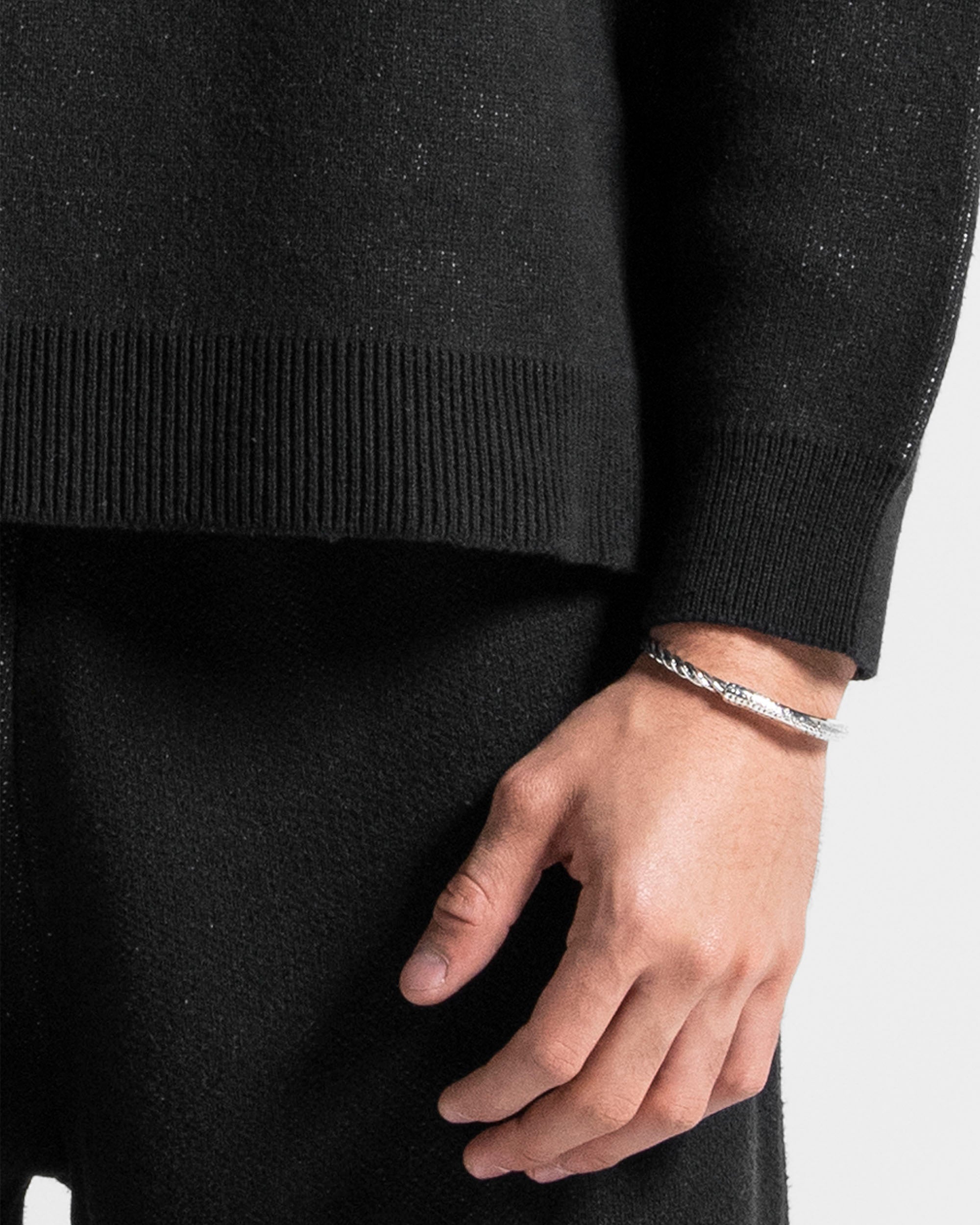 Destaca por sus elegantes bordados blancos integrados en el tejido negro, creando un contraste visual sofisticado.