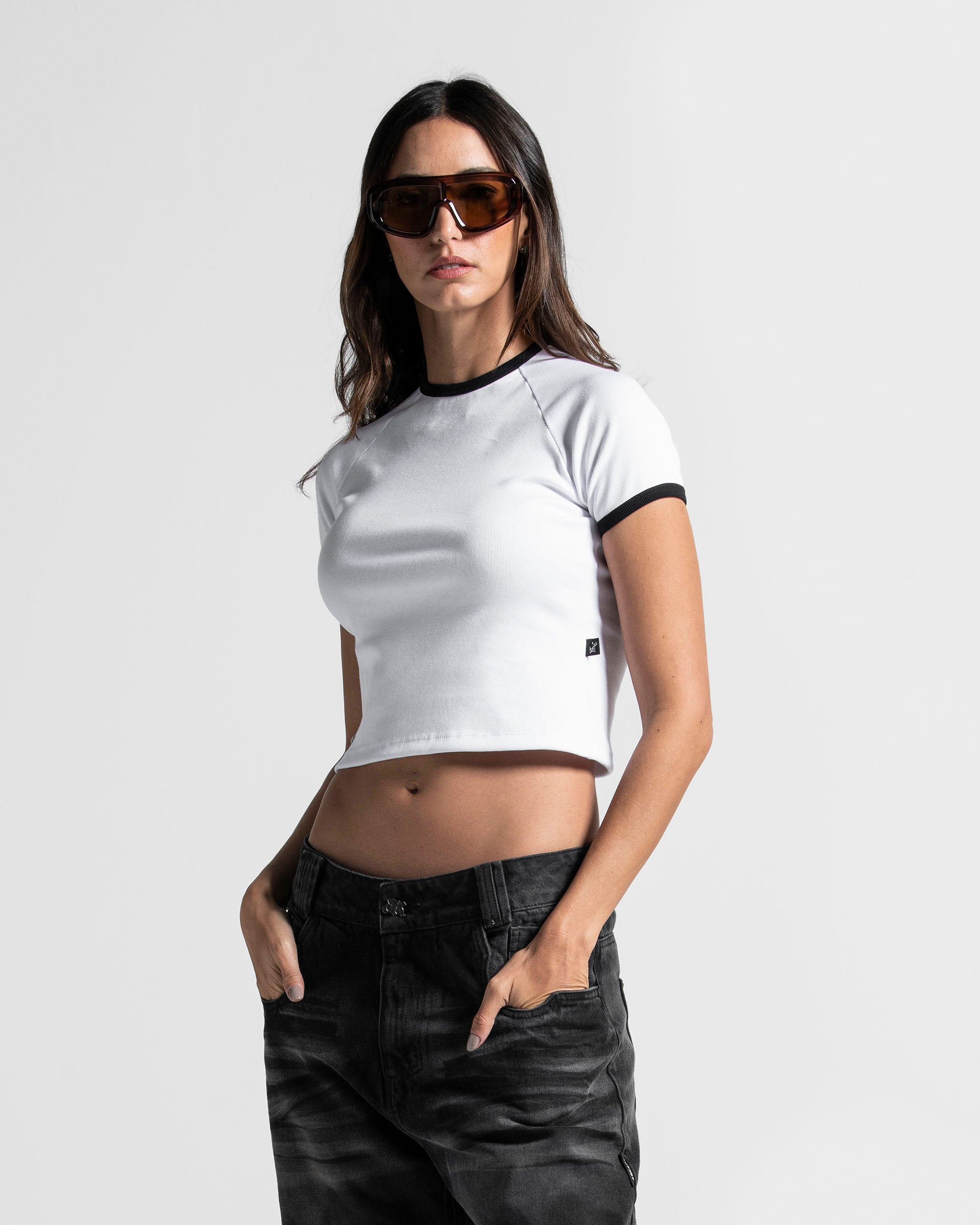 Camiseta corta y ajustada confeccionada en tela rib de alta calidad. Diseño clásico en blanco con mangas y cuello en contraste negro.