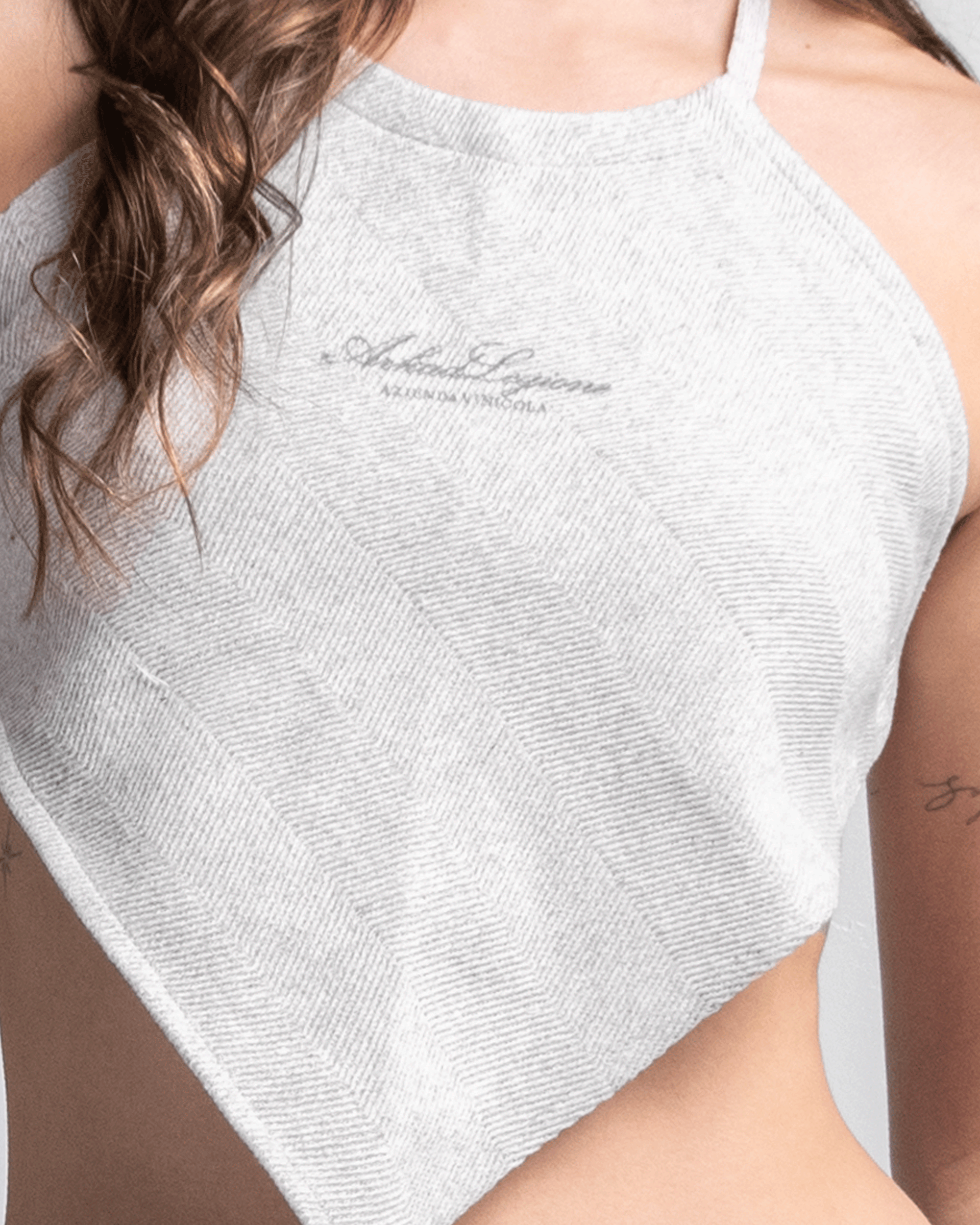 Este top está confeccionado en tela tejida espina de pescado la cual aporta textura. Su diseño triangular en la parte frontal ofrece un detalle estructurado y moderno, mientras que las tiras ajustables en la espalda permiten un calce personalizado. Estampado distintivo de la colección en la parte central.