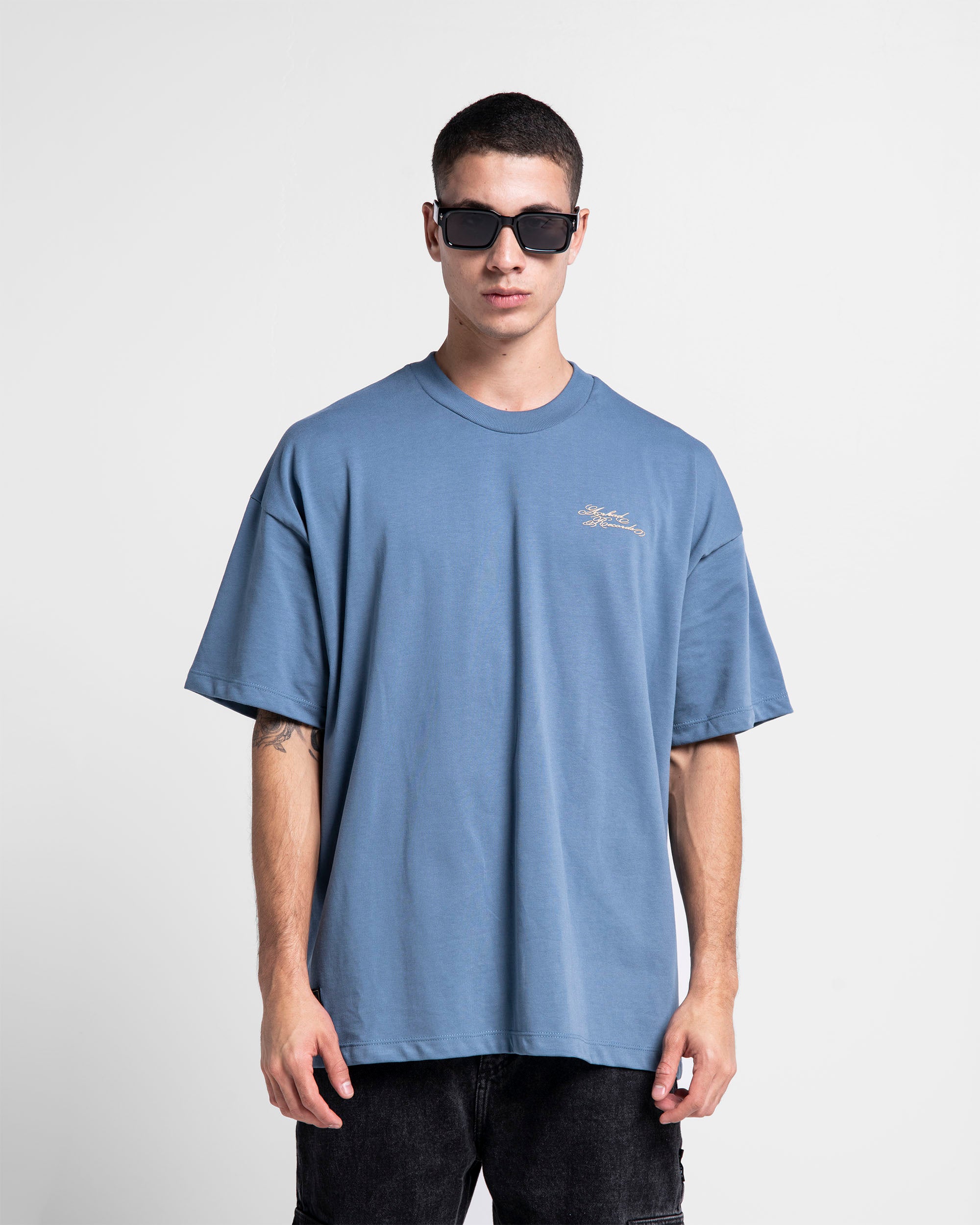 Esta camiseta de fit oversize está confeccionada en algodón 100% de alto gramaje en color azul con gráficos estampados en serigrafía y alta densidad en el frente y la parte posterior. Detalles como la marquilla tejida de la colección complementan un diseño exclusivo y autentico de la marca.