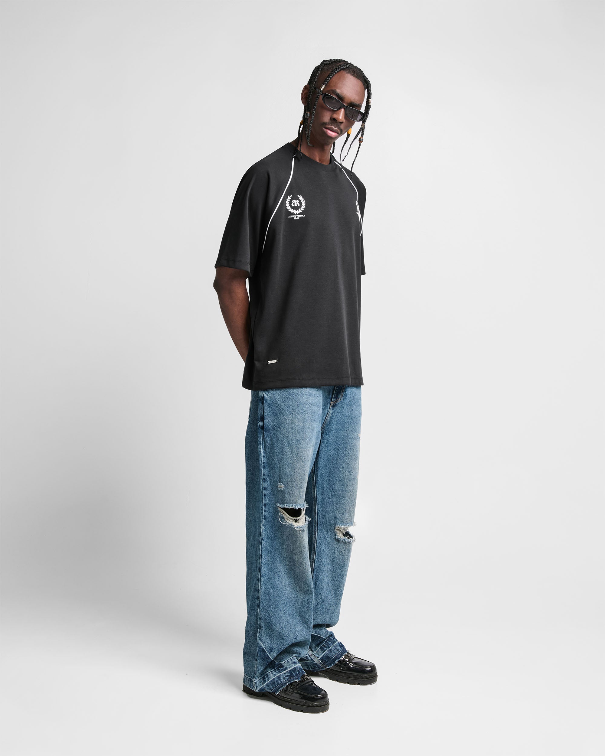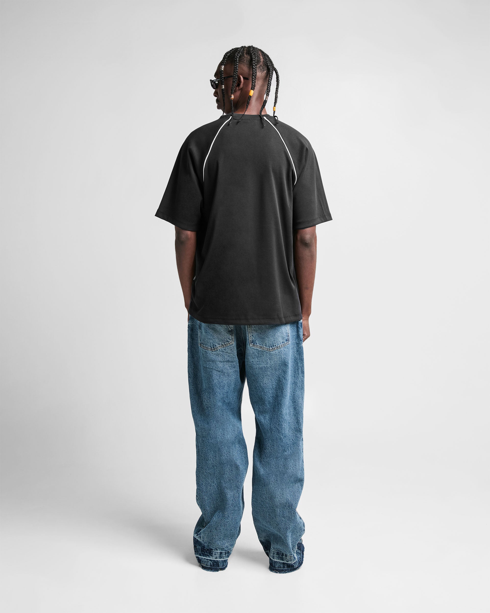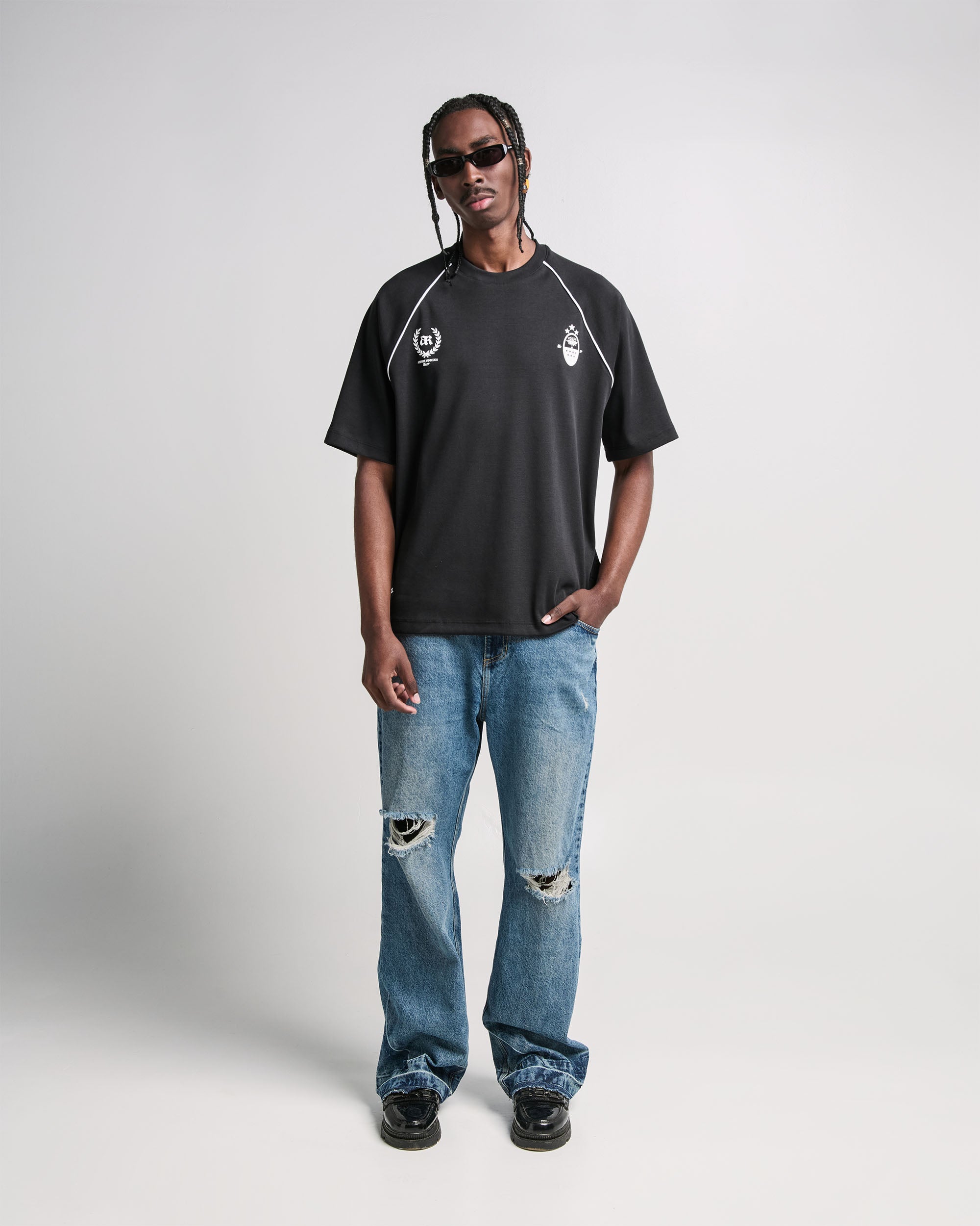 Esta camiseta de fit oversize y corte raglan está confeccionada en algodón 100% de alto gramaje en color negra con gráficos estampados en serigrafía y alta densidad en el frente. Detalles como el rubber y el banderín de la marca complementan un diseño exclusivo y autentico.