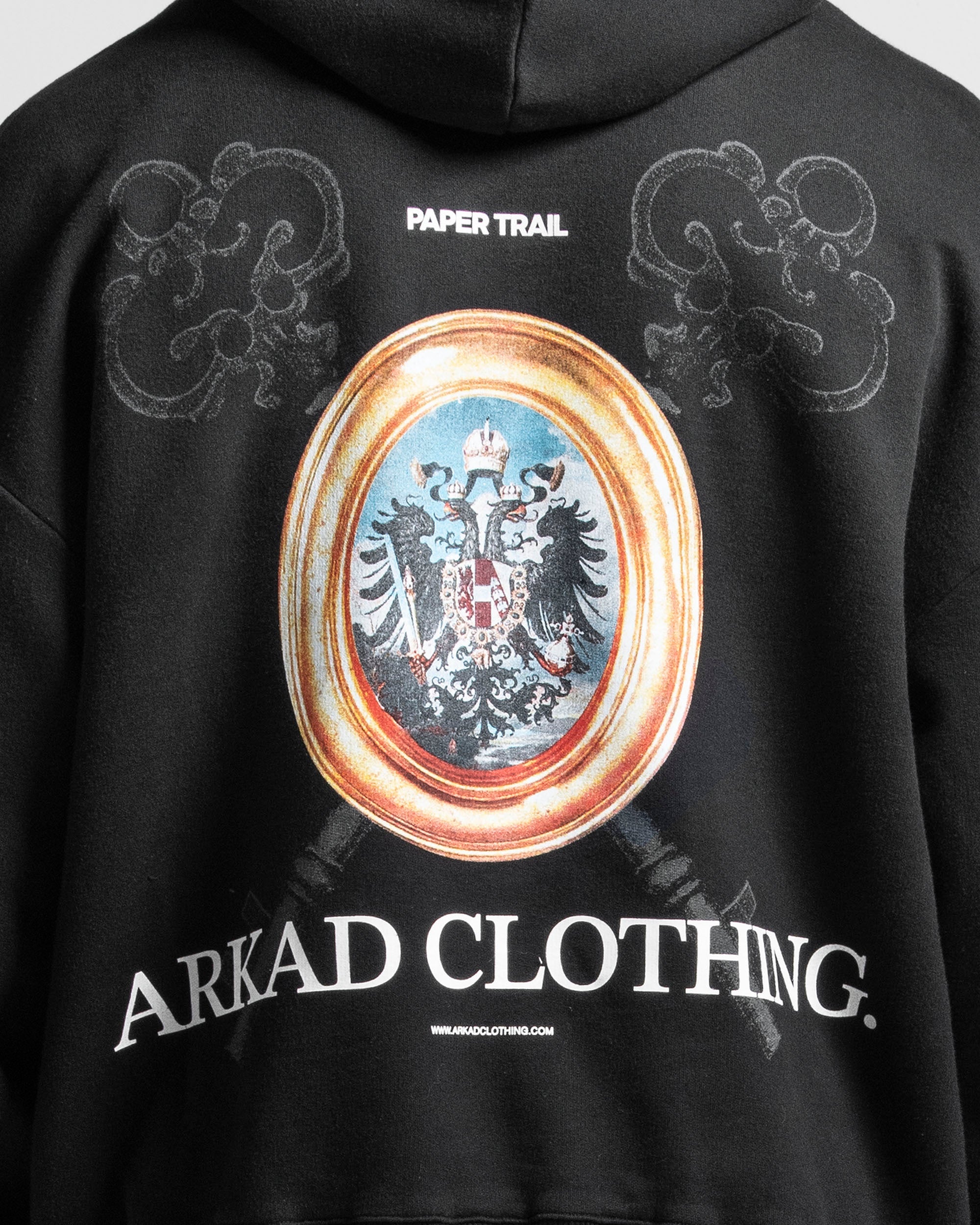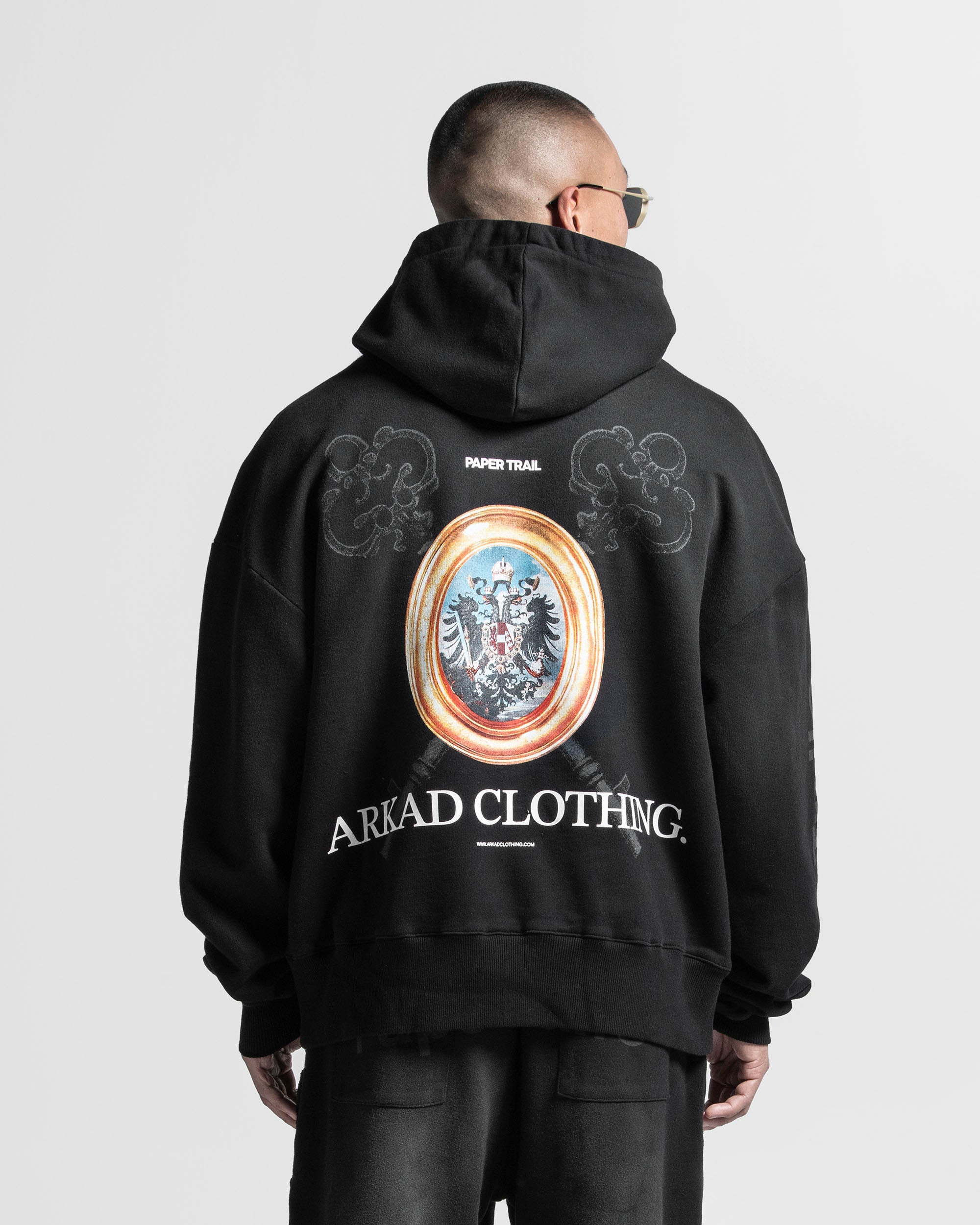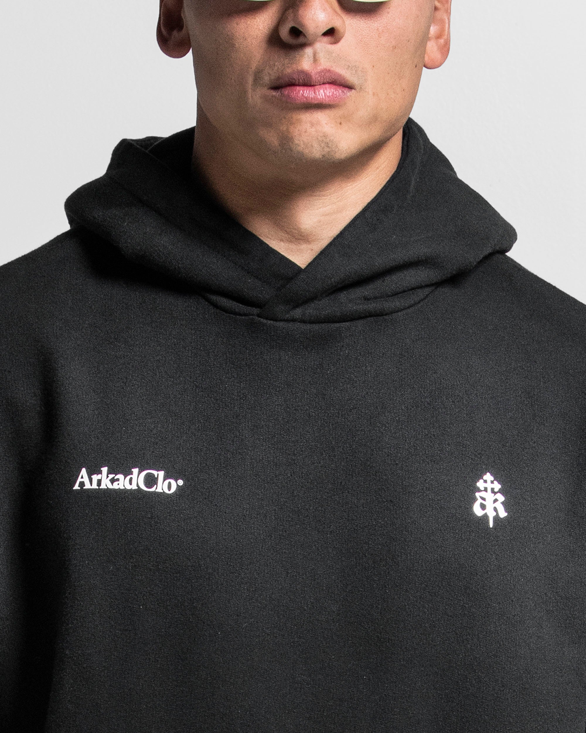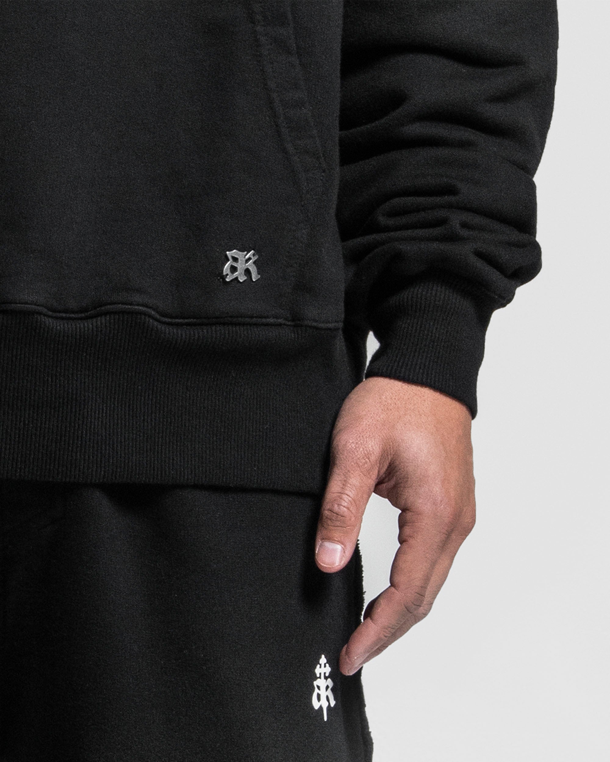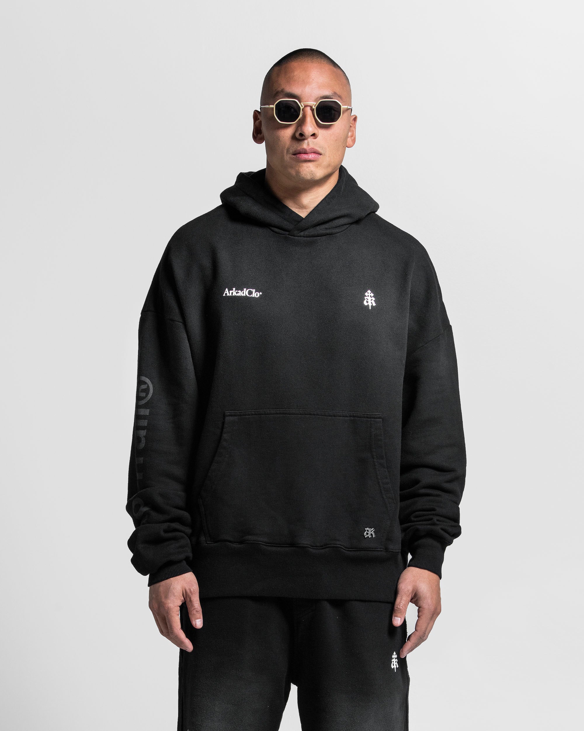Hoodie negro en algodón de alto gramaje que destaca por su proceso de lavado artesanal que crea un acabado de iluminaciones sutiles.